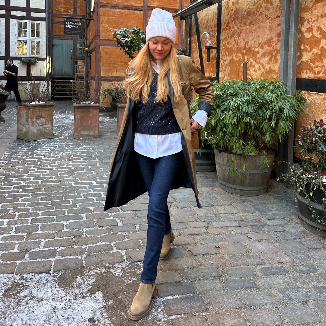 For et lettere, mere city-agtigt udtryk anbefaler vi også fine fløjlskvaliteter i pin cord. De har den samme bløde fornemmelse, men fremstår slankere og mere glatte i overfladen. Pin cord fungerer fremragende, når du vil have et par bukser, der føles behagelige hele dagen og samtidig kan gå direkte fra møder til middag. En kort blazer eller en indtucked skjorte holder linjen stram, mens en tynd strik gør looket afslappet uden at blive casual. De mørke nuancer er sikre i mange år, men sand, taupe og dyb bordeaux giver en elegant variation, der stadig er let at style.