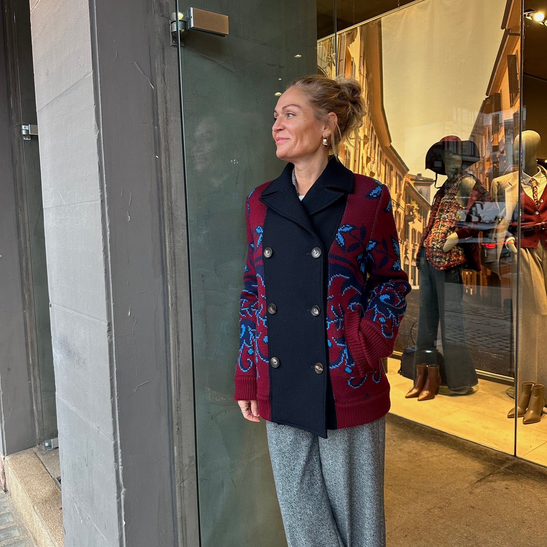Dobbeltradet foret jakke i kombination af vævet uld og jacquardstrik - med fin spænde tamp på ryggen
