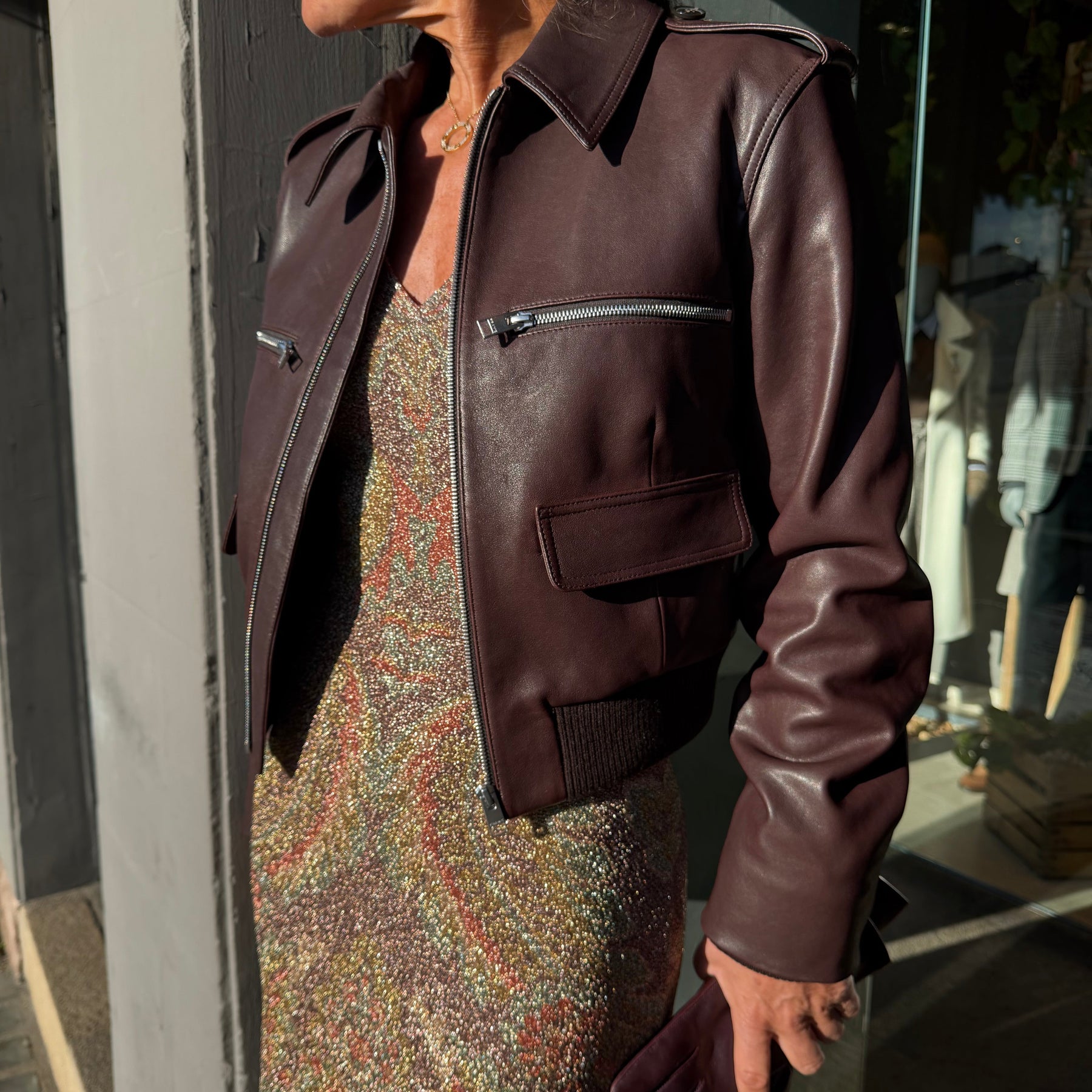 Skøn kort skindjakke med ribkant og uniform-inspireret skulderstropper.