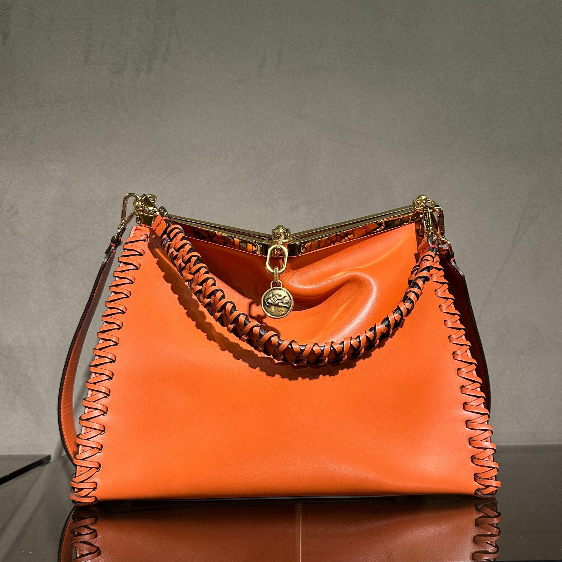 Taske med hånd- og skulderrem, flettede detaljer og kuglekædelukning